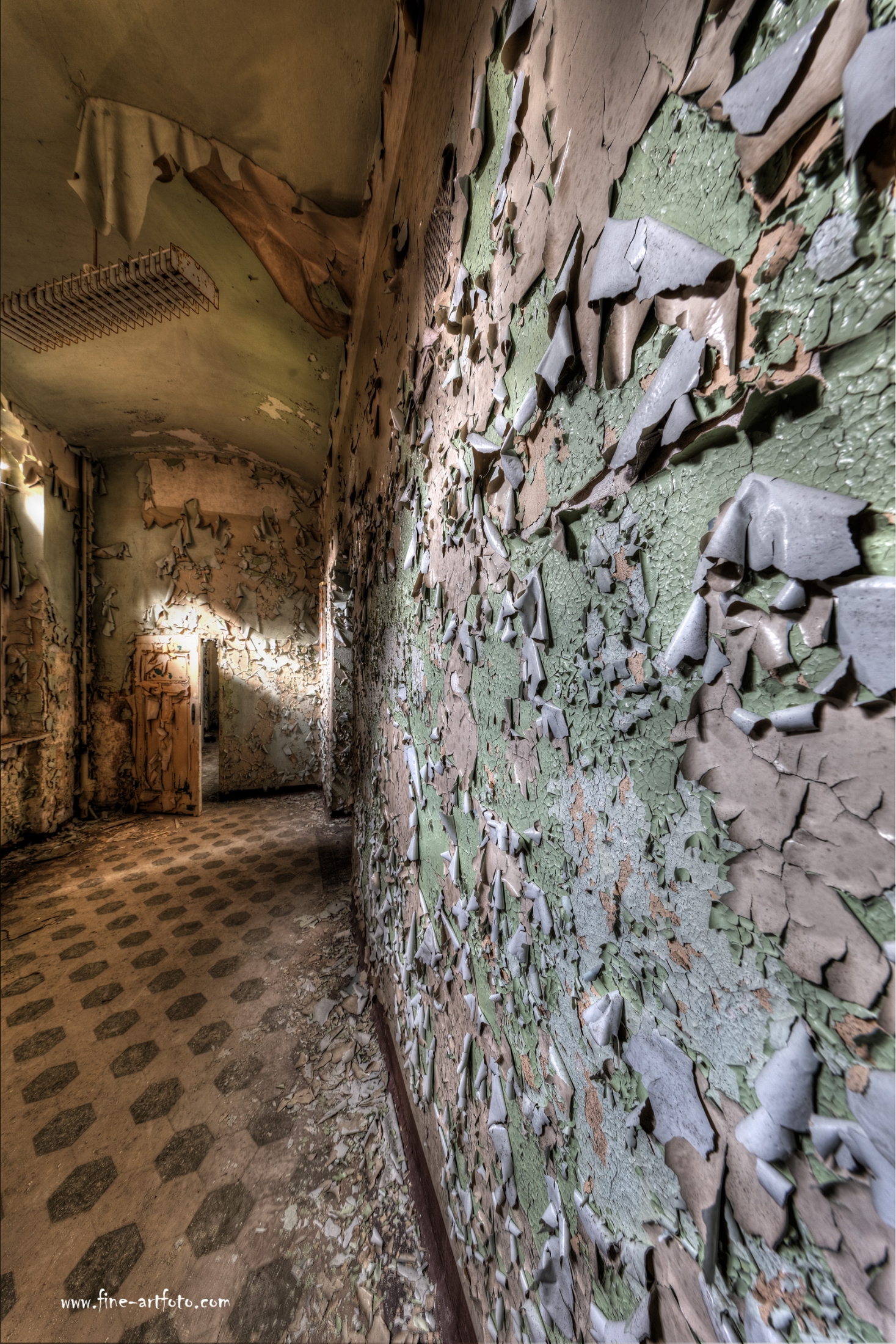 Beelitz today is corridors and flaking color. Interior, lamps and beds are now fully lost and disapeared.
