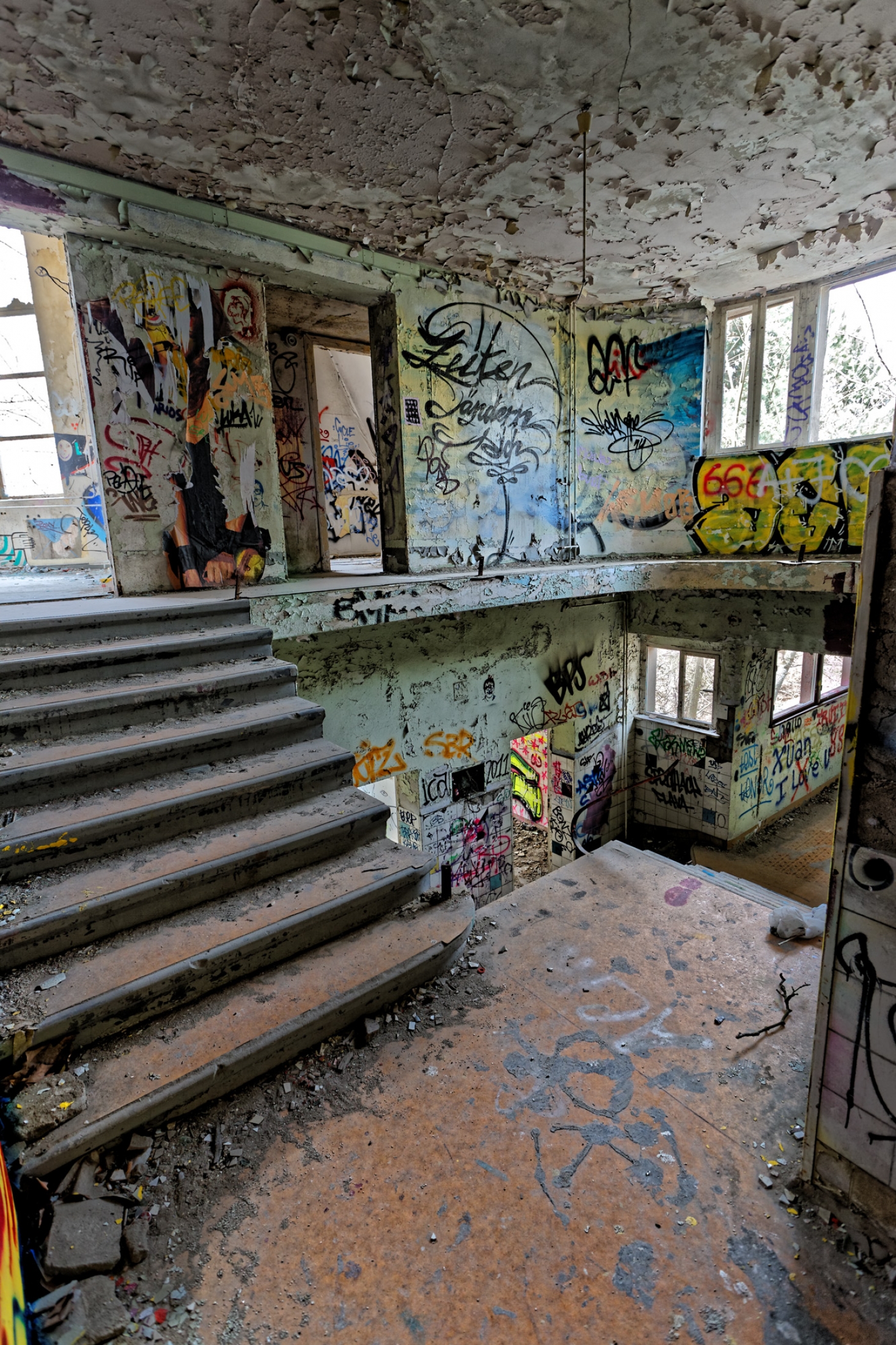 Once a huge childrens clinic now a shattered and abandoned place that was long time free accessible. For this reason Berlin´s artists and sprayers used this site to show their art. Even Graffiti artists from switzerland used this place to create their huge pictures.