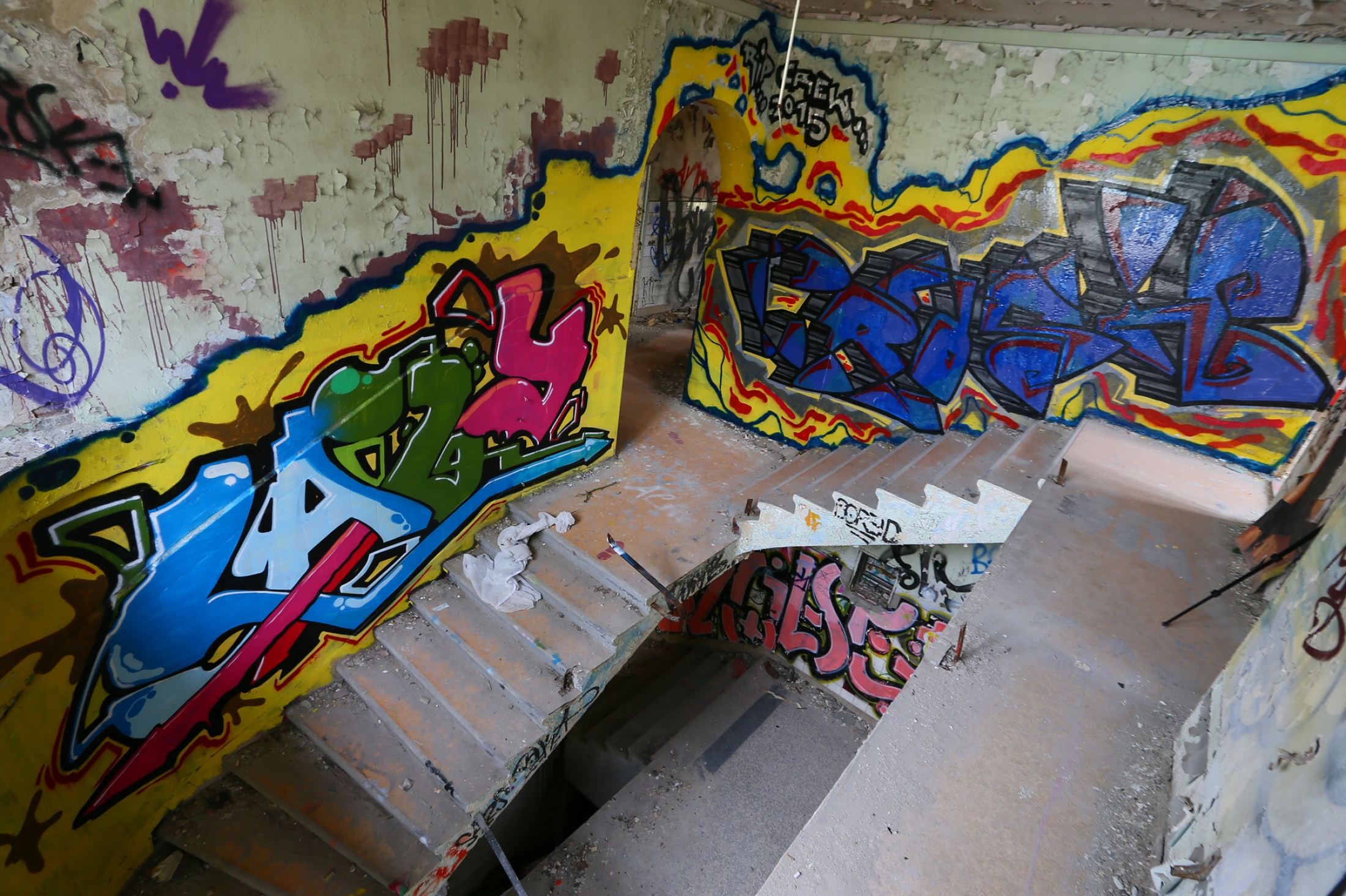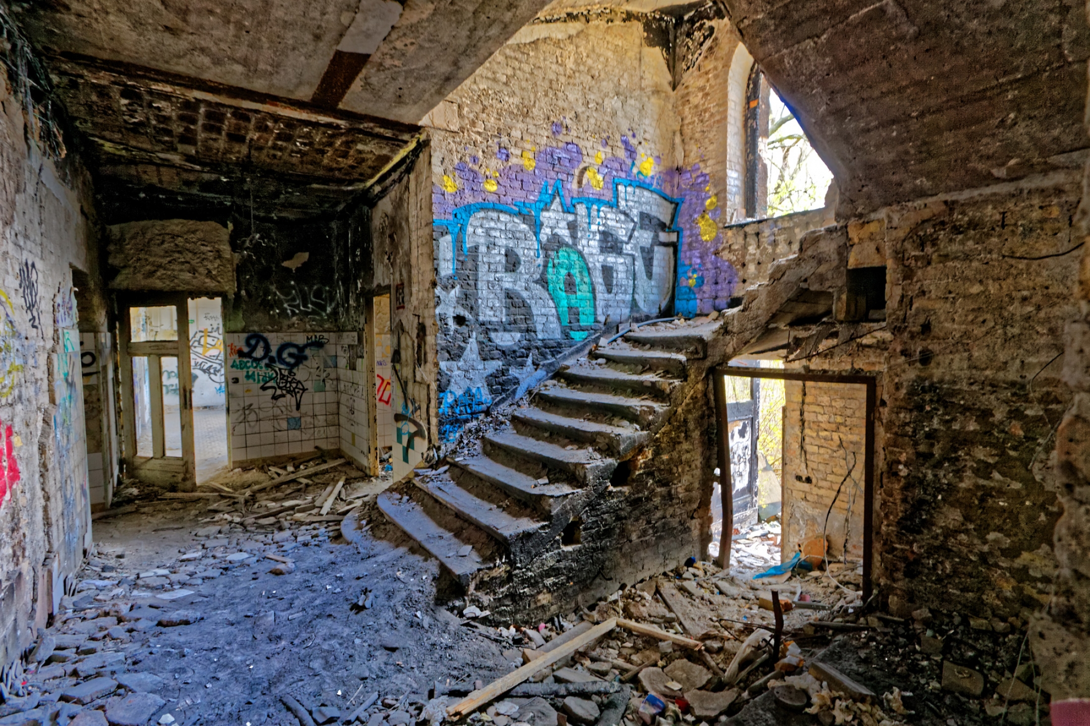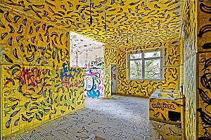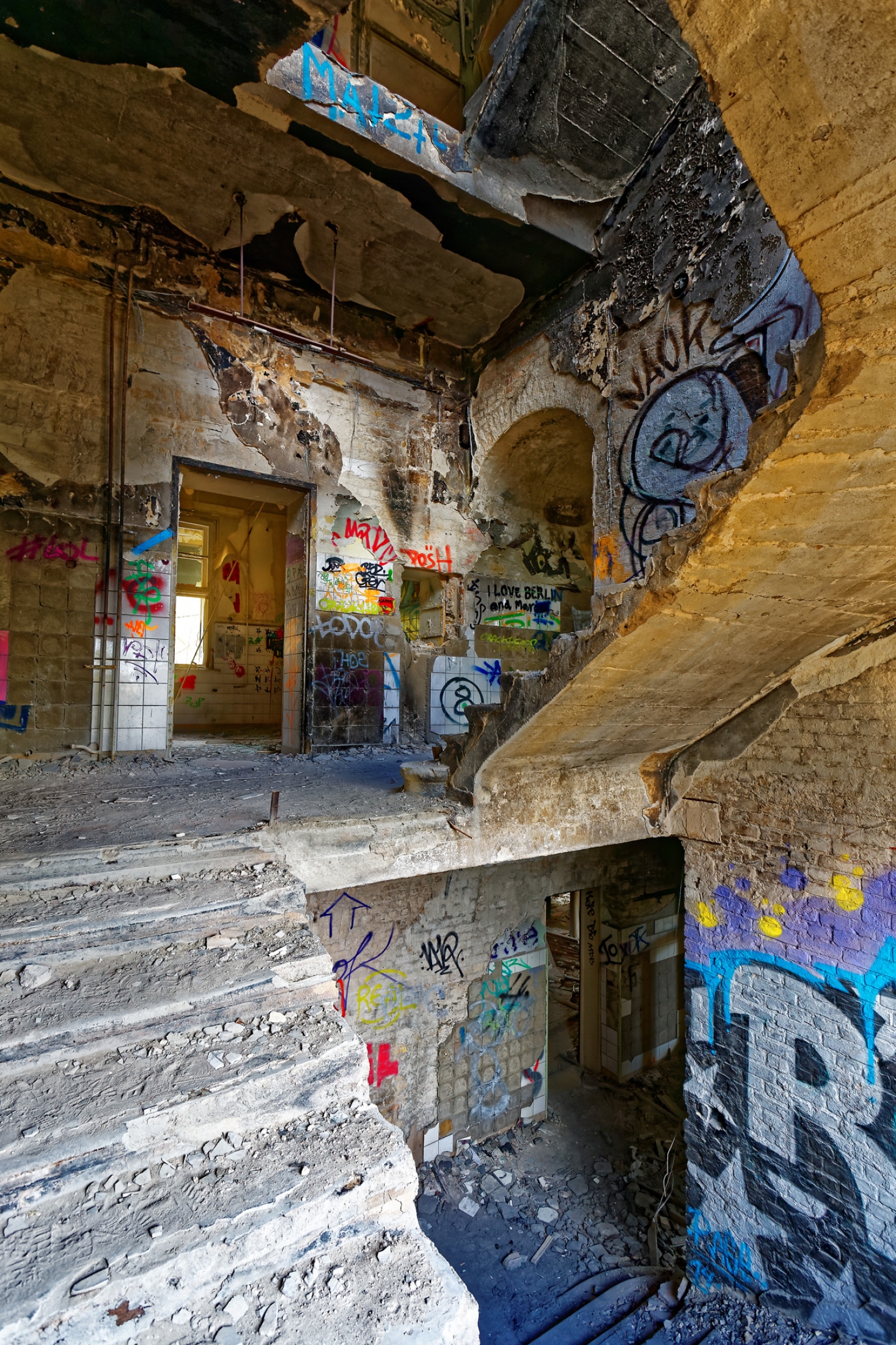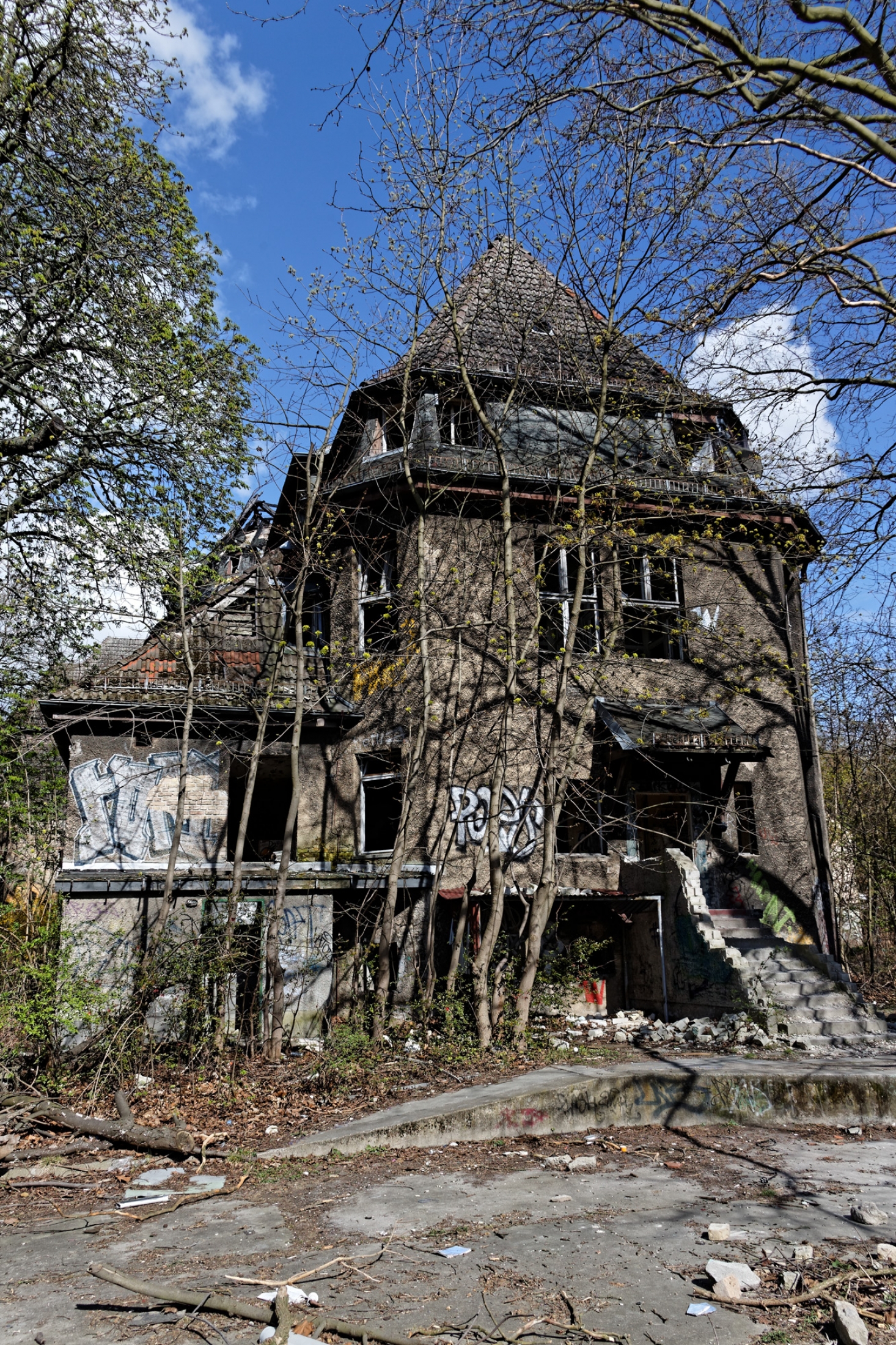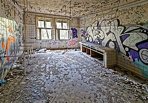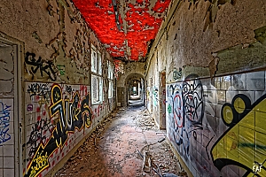 Once a huge childrens clinic now a shattered and abandoned place that was long time free accessible. For this reason Berlin´s artists and sprayers used this site to show their art. Even Graffiti artists from switzerland used this place to create their huge pictures.